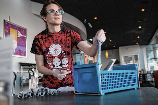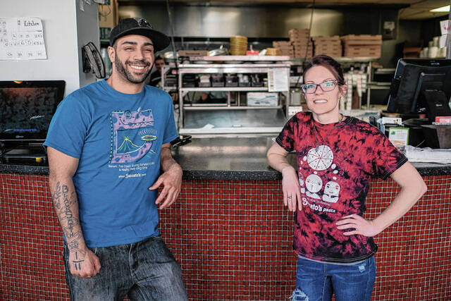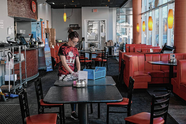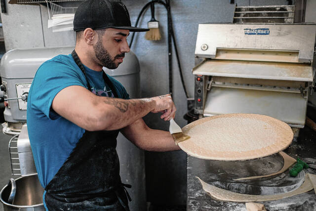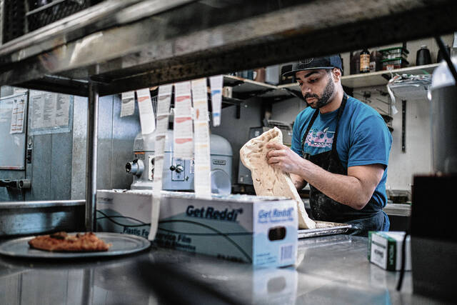 Mike Wolanin | The Republic Bucceto’s Pizza Pasta manager Julian White preps pizza dough to be made into pizzas at Bucceto’s in downtown Columbus, Ind., Friday, Feb. 18, 2022. Non-profit organization Bartholomew County Work helped White get his jobs at Bucceto’s after he got out of prison. He started as a bus boy and now manages the restaurant. Bartholomew County Works helps unemployed and under-employed people find work.