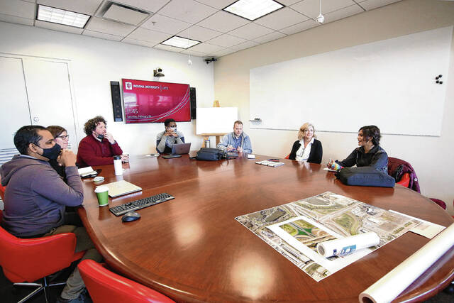 Students from Indiana University’s J. Irwin Miller Architecture Program worked alongside professionals at an architectural “charrette” in late February to brainstorm possible concepts for the future of the red, double-arched bridge at the I-65 interchange with State Road 46 on the city’s