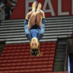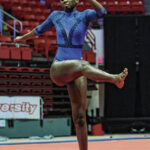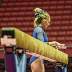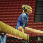 Moore and her Bull Dog teammates began the day on the beam. She won that event with a 9.825, breaking her own school record and defending the beam title she won last year.