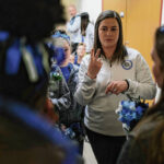 Columbus North’s Emily Moore, in blue, is mobbed by her coaches Bob Arthur, left, and Kaitlyn Rediker after completing her beam routine in the IHSAA gymnastics state finals at Worthen Arena in Muncie, Ind., Saturday, March 12, 2022.