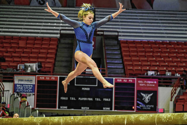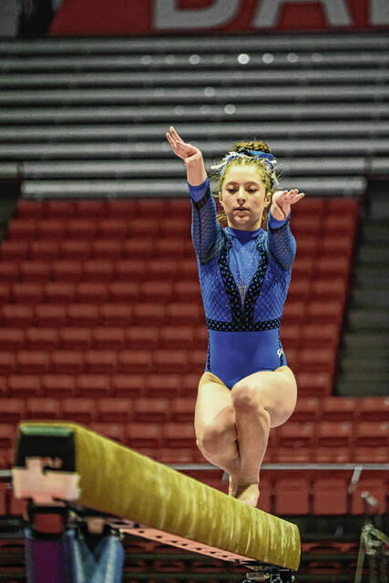 Columbus North’s Emily Moore competes on the balance beam in the IHSAA gymnastics state finals at Worthen Arena in Muncie, Ind., Saturday, March 12, 2022.