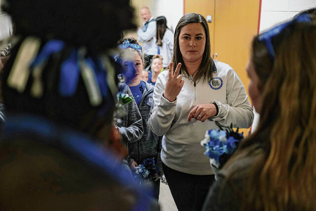 Columbus North’s Emily Moore, in blue, is mobbed by her coaches Bob Arthur, left, and Kaitlyn Rediker after completing her beam routine in the IHSAA gymnastics state finals at Worthen Arena in Muncie, Ind., Saturday, March 12, 2022.