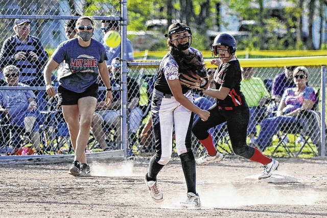 Jennings County’s Delaynee McCreary gets in position to run to third base during a softball game April 27, 2021, at Columbus East.