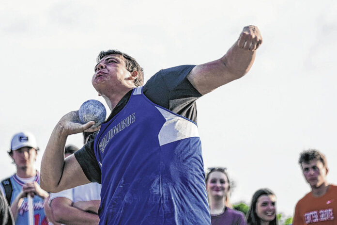 Columbus North’s Tucker Smith competes in the shot put during the sectional track meet at Columbus North High School in Columbus, Ind., Thursday, May, 20, 2021.
