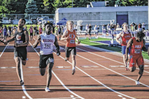 Columbus East’s Ethan Duncan, center, crosses the finish line in the 4×100-meter relay during the Boys Track and Field State Finals at Ben Davis High School in Indianapolis, Friday, June 4, 2021.