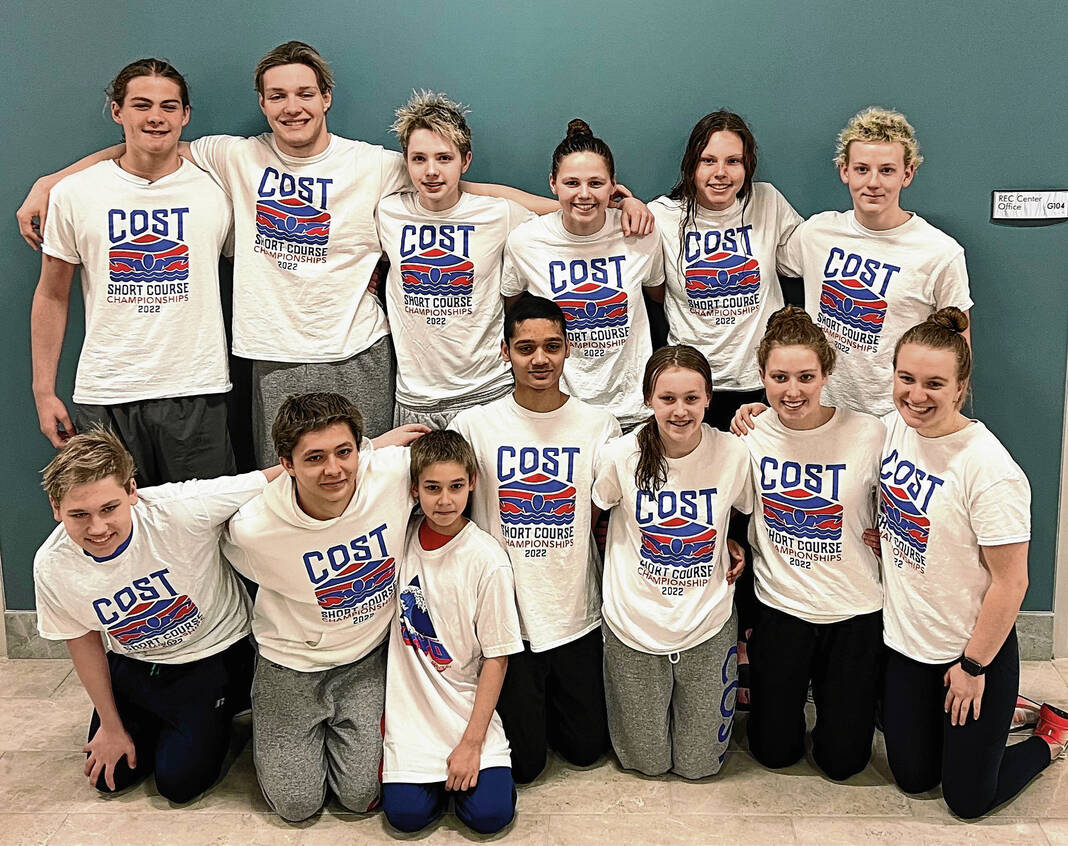 Club Olympia swimmers competed in last weekend’s Indiana Senior State Championships in Elkhart. Pictured are, front row from left, Misha Machavariani, Cole Ehara, Tony Machavariani, Pratt Badve, Connelly Furnish, Maggie Johnson, Annie Murer; and back row, Judah Nickoll, Dathan Wolf, Cavan Stilson, Ashley Freel, Hope Westphal and Ty Mayer.