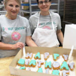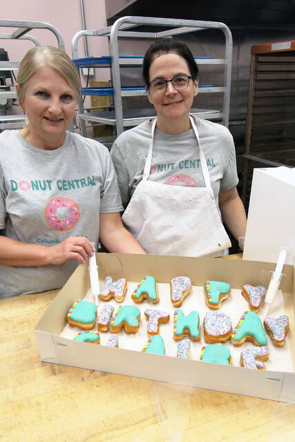 Norma McLeod and Stephanie Long with a box of specialty donuts for a birthday with injectors that customers can use to fill their own donuts with their choice of cream fillings, at Donut Central on Friday, March 11, 2022 Carla Clark | For The Republic