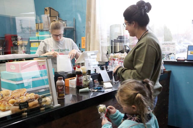 Marlee Brunni, at left, helps customers Whitney Akins and Oaklyn Akins, holding a cake pop, at Donut Central, Friday, March 12, 2022 Carla Clark | For The Republic