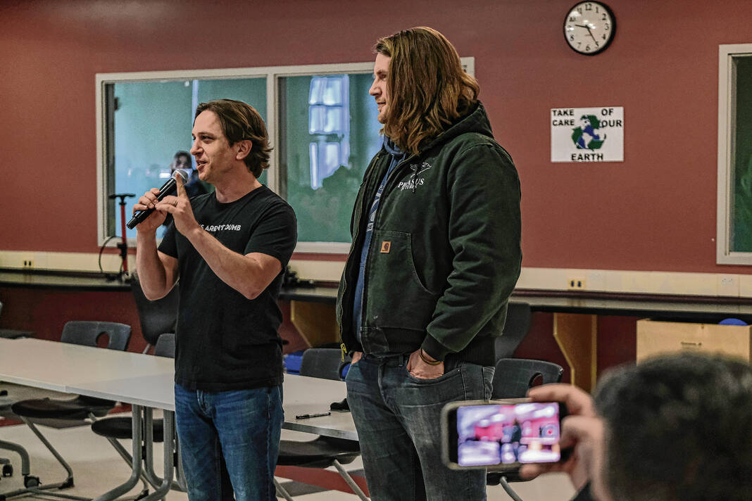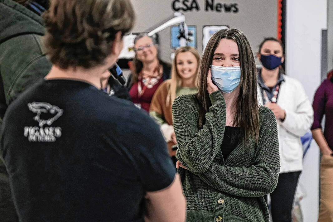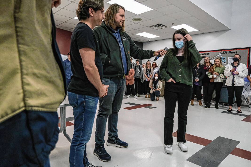 Mike Wolanin | The Republic Pigasus Pictures co-founders John Armstrong, left, and Zachary Spicer announce that CSA New Tech senior Piper Parks won the Project Pigasus Film Project during a student assembly at CSA New Tech High School in Columbus, Ind., Monday, March 28, 2022.