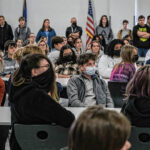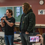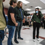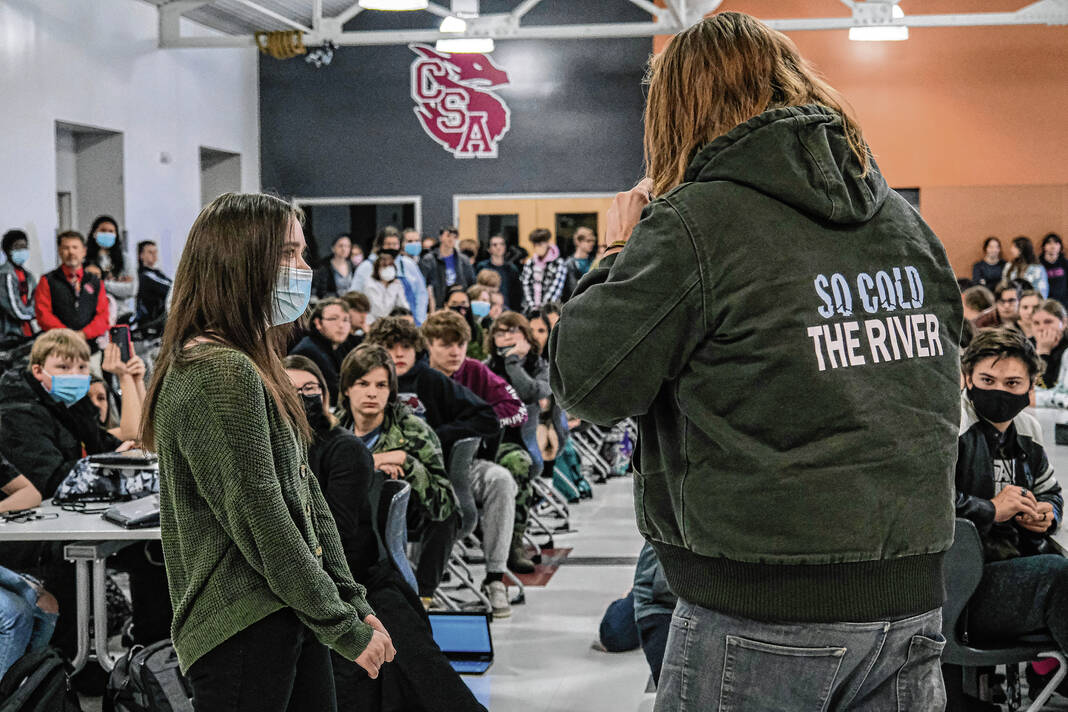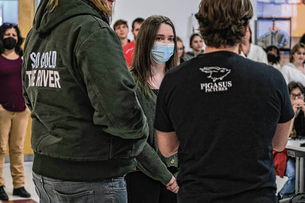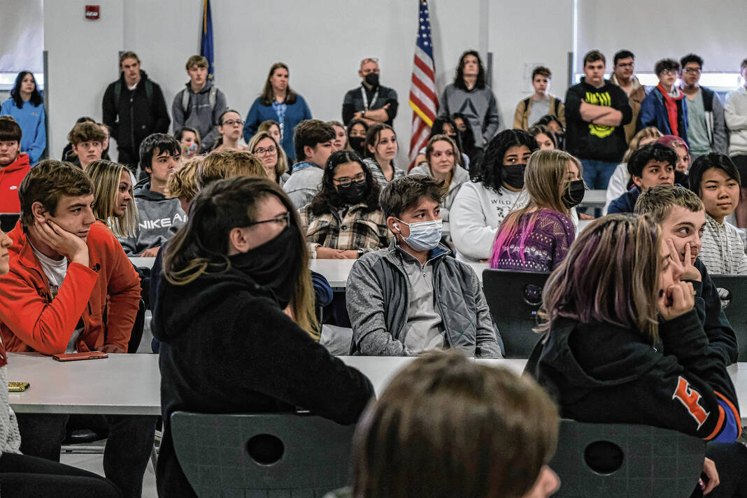 Mike Wolanin | The Republic CSA New Tech students listen as Pigasus Pictures co-founders John Armstrong, left, and Zachary Spicer announce that CSA New Tech senior Piper Parks won the Project Pigasus Film Project during a student assembly at CSA New Tech High School in Columbus, Ind., Monday, March 28, 2022.