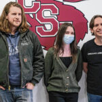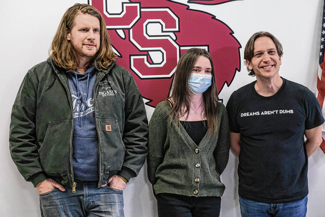 Mike Wolanin | The Republic CSA New Tech senior Piper Parks, center, talks with Pigasus Pictures co-founders John Armstrong, right, and Zachary Spicer, left, after they announced she won the Project Pigasus Film Project during a student assembly at CSA New Tech High School in Columbus, Ind., Monday, March 28, 2022.