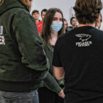 Mike Wolanin | The Republic CSA New Tech senior Piper Parks talks with Pigasus Pictures co-founders John Armstrong and Zachary Spicer, left, after they announced she won the Project Pigasus Film Project during a student assembly at CSA New Tech High School in Columbus, Ind., Monday, March 28, 2022.