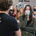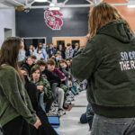 Mike Wolanin | The Republic CSA New Tech senior Piper Parks, left, talks with Pigasus Pictures co-founder Zachary Spicer it was announced that she won the Project Pigasus Film Project during a student assembly at CSA New Tech High School in Columbus, Ind., Monday, March 28, 2022.