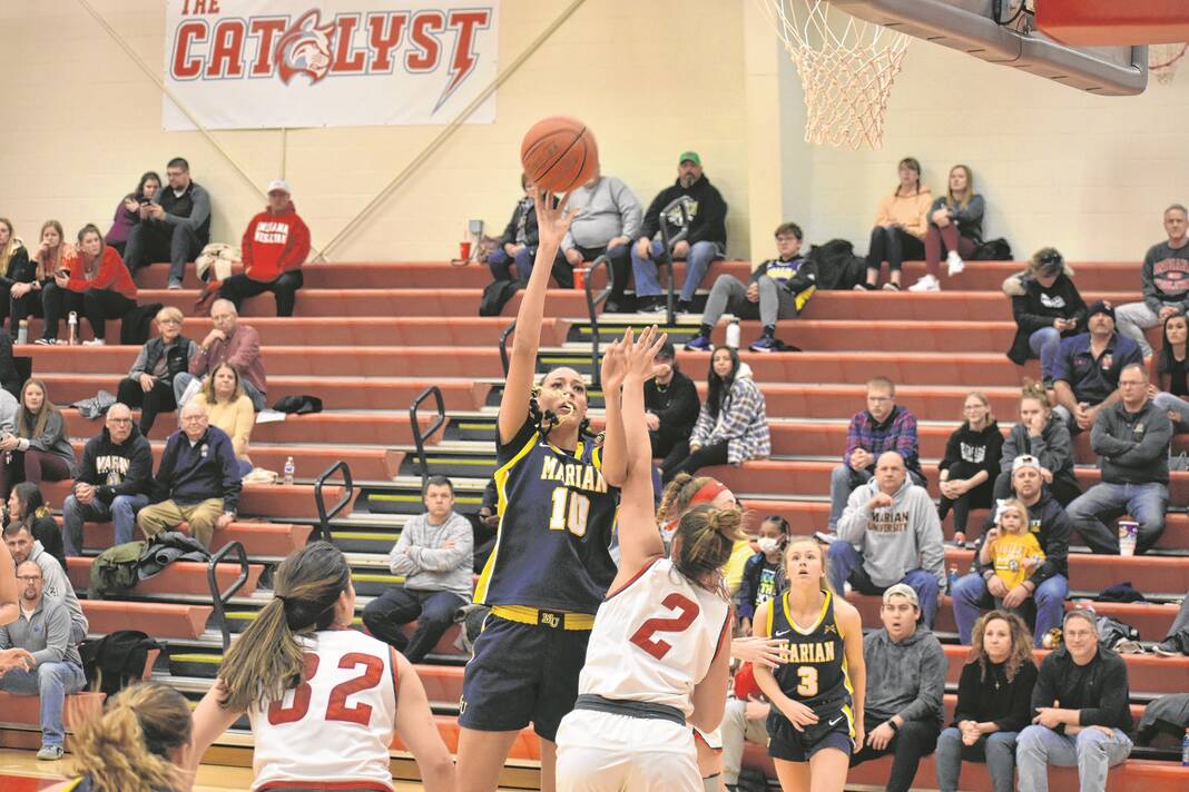 Columbus North graduate and Marian senior Imani Guy takes a shot during a game this season.