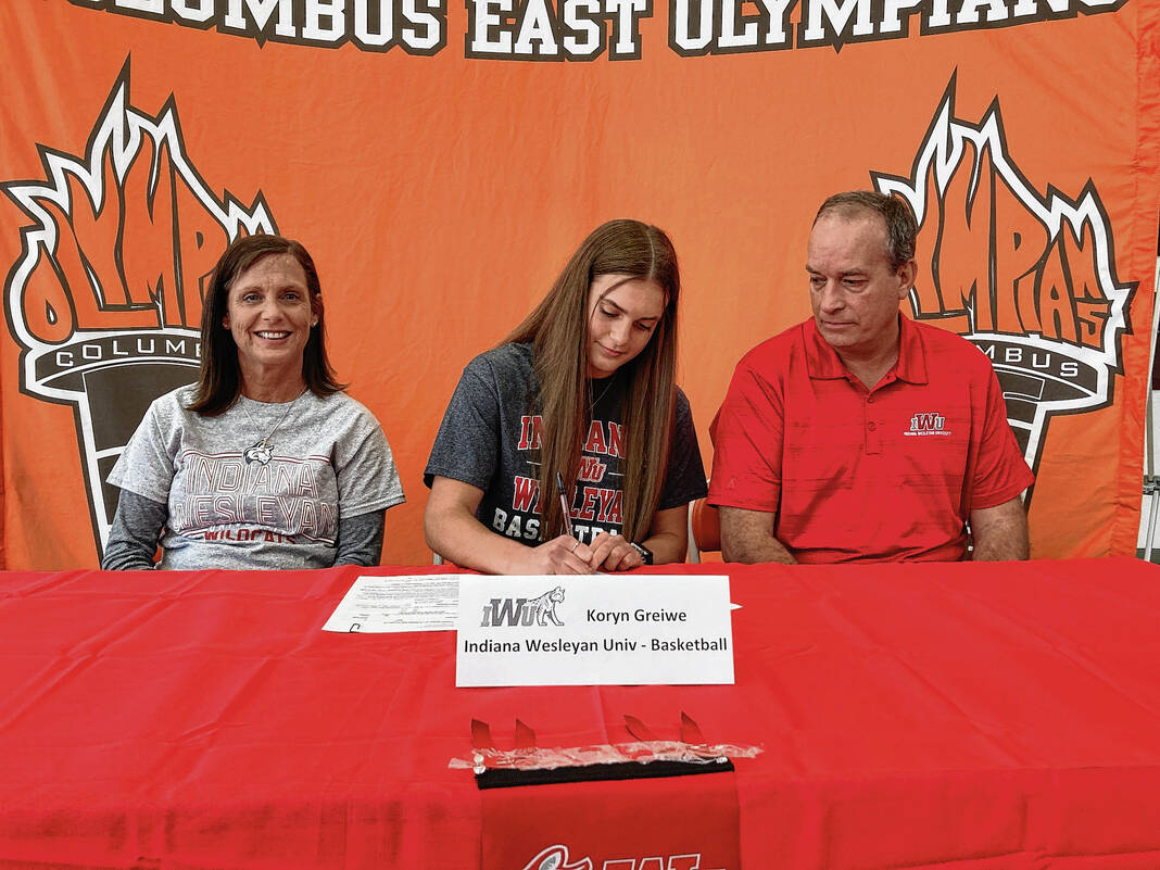 Columbus East senior Koryn Greiwe, center, signs a letter-of-intent to play basketball at Indiana Wesleyan on Friday at East. She is joined by her parents Kerry and Keith Greiwe.