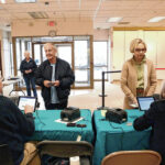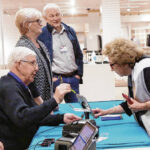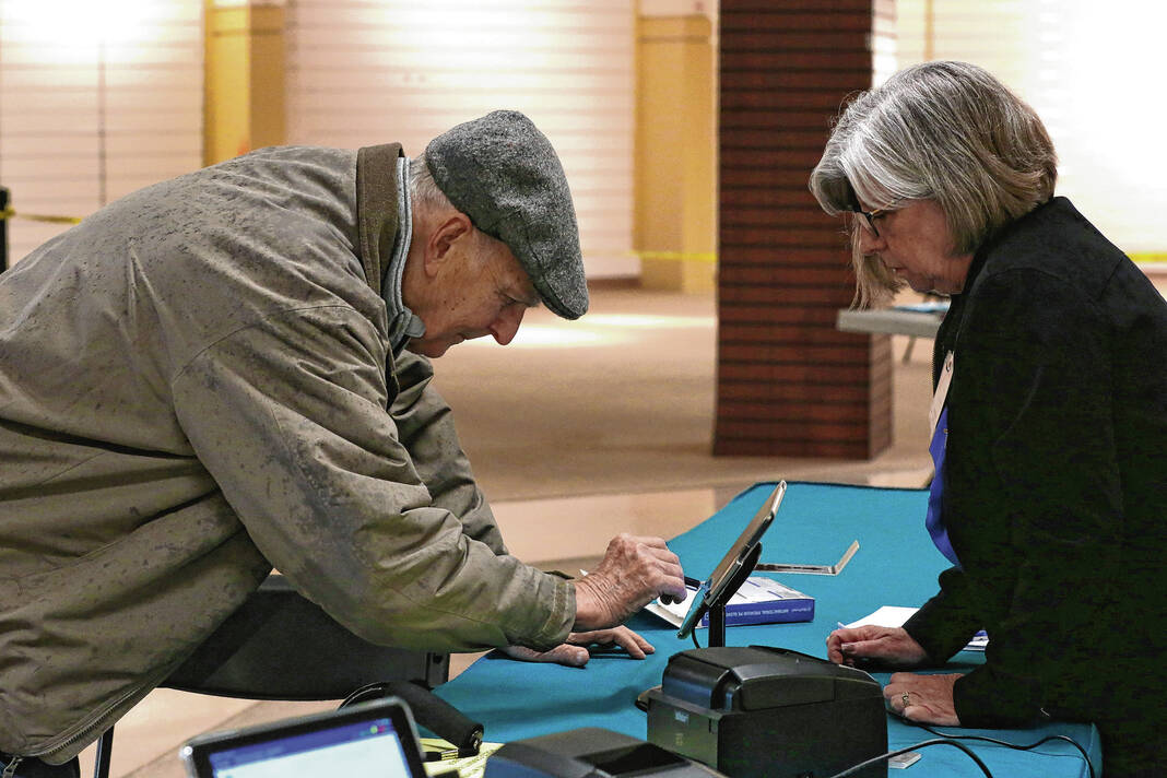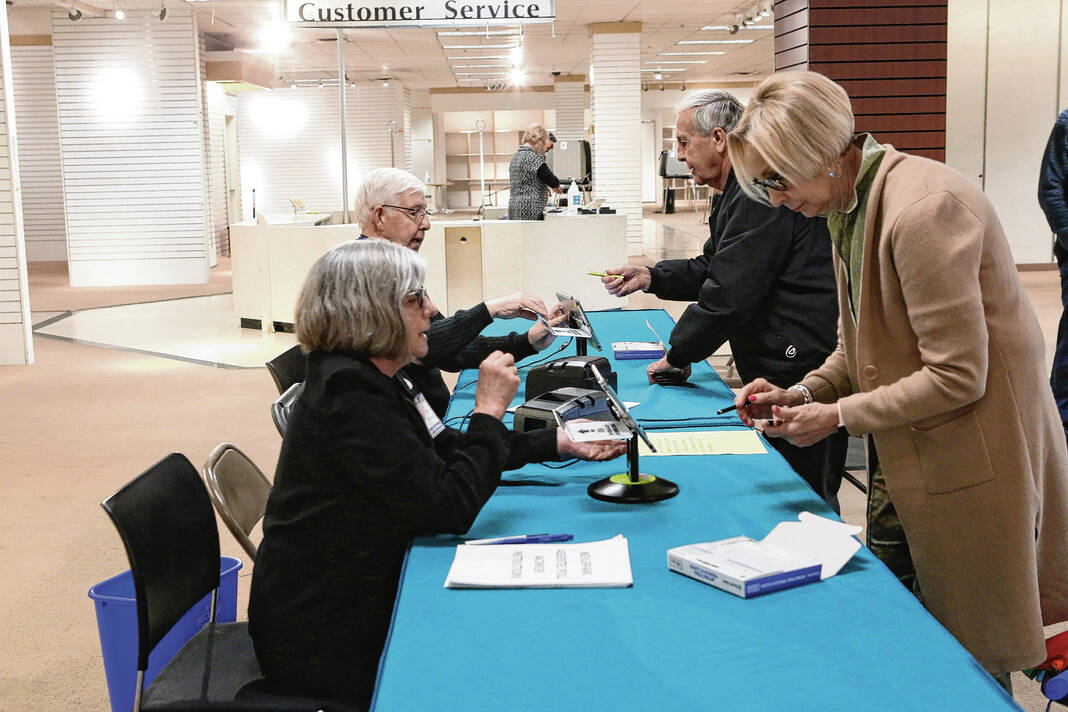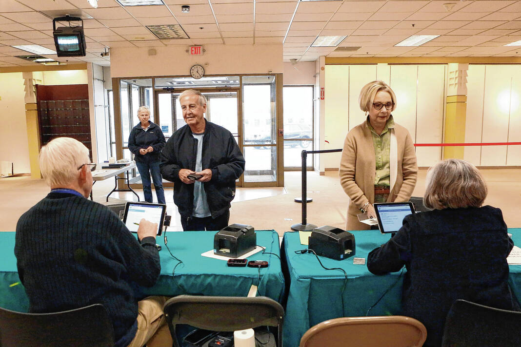 Carla Clark | For The Republic Jerry Simo, at left, assists Nany Ann Pence-Fritsch as she checks in for early voting for the primary at the early voting center located at NexusPark in Columbus, Indiana, Tuesday, April 5, 2022.