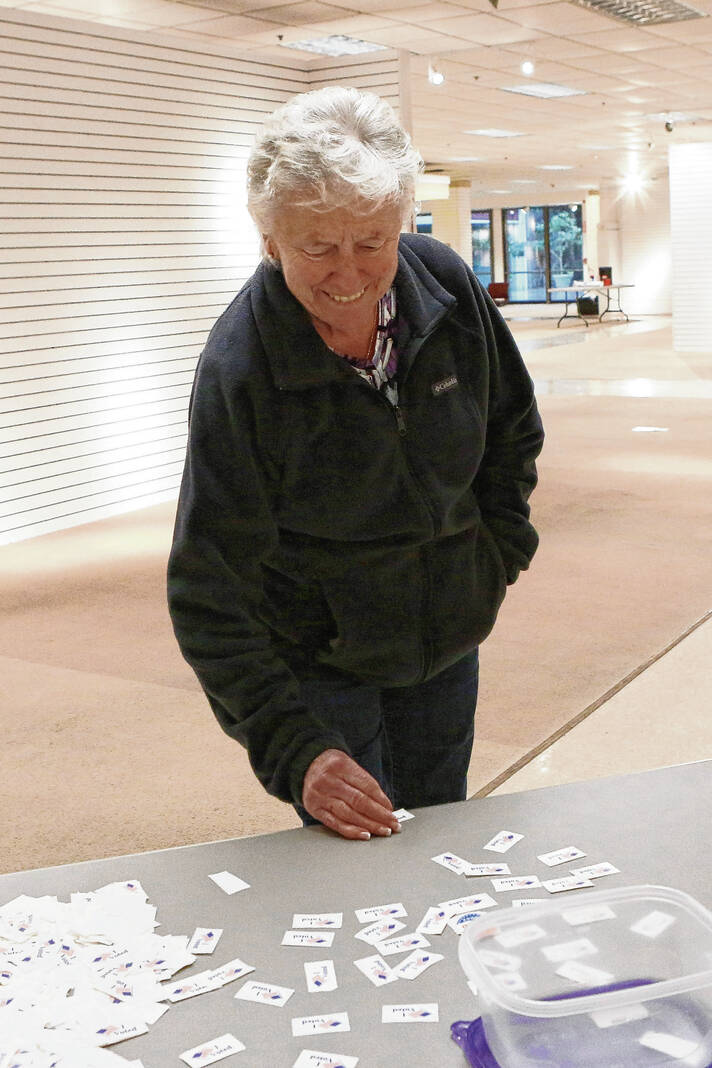 Carla Clark | For The Republic Donna Emmert picks up a sticker after she casts her ballot during early voting in the primary at the early voting center located at NexusPark in Columbus, Indiana, Tuesday, April 5, 2022