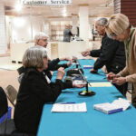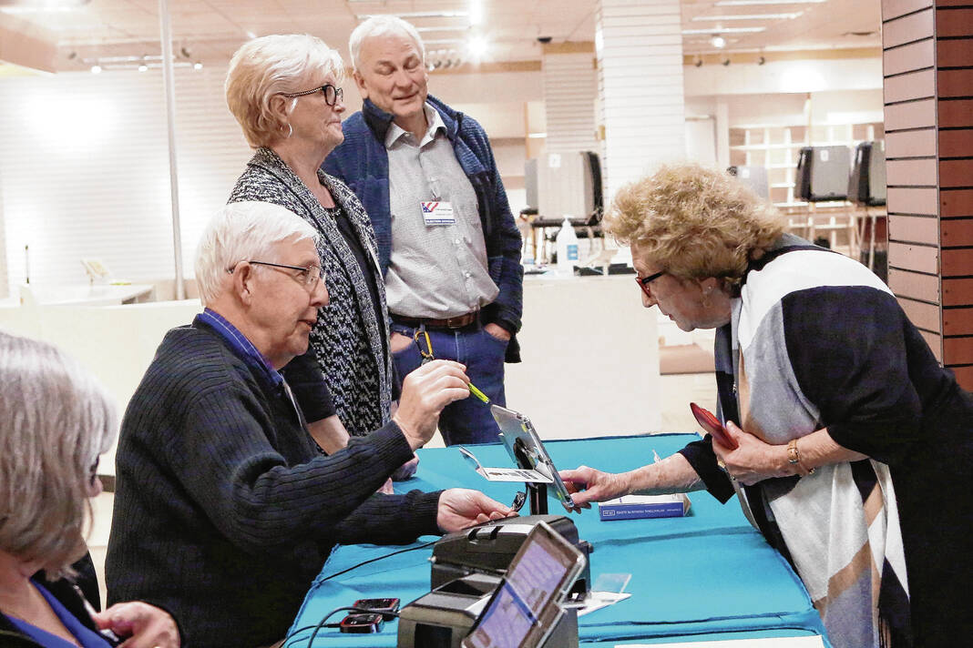 Carla Clark | For The Republic Alfred Hill and Betty Hill, standing, are assisted by Jerry Simo and Debbie Lukas as they check for early voting in the primary at the early voting center located at NexusPark in Columbus, Indiana, Tuesday, April 5, 2022