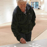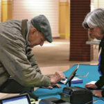 Carla Clark | For The Republic Basil Fritsch signs his name as Debbie Lukas looks on during early voting for the primary election at the early voting center located at NexusPark in Columbus, Indiana, Tuesday, April 5, 2022.