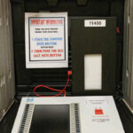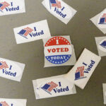 Carla Clark | For The Republic “I Voted” stickers at the early voting center located at NexusPark in Columbus, Indiana, Tuesday, April 5, 2022.