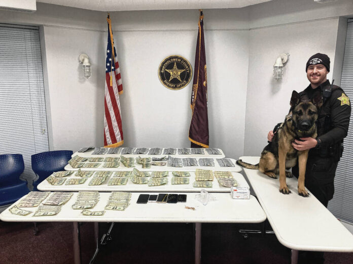Photo provided Bartholomew County Sheriff Deputy Dylan Prather and K9 Frizko are shown with the drugs and cash confiscated after the Friday traffic stop.
