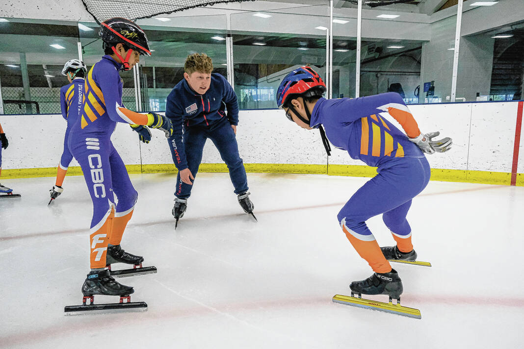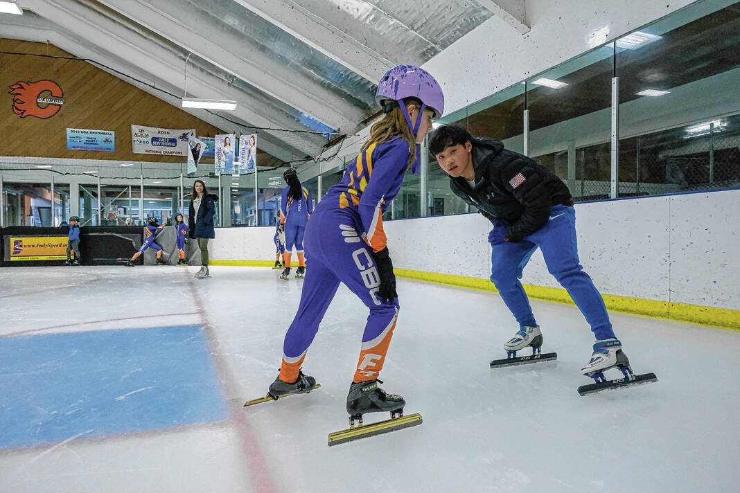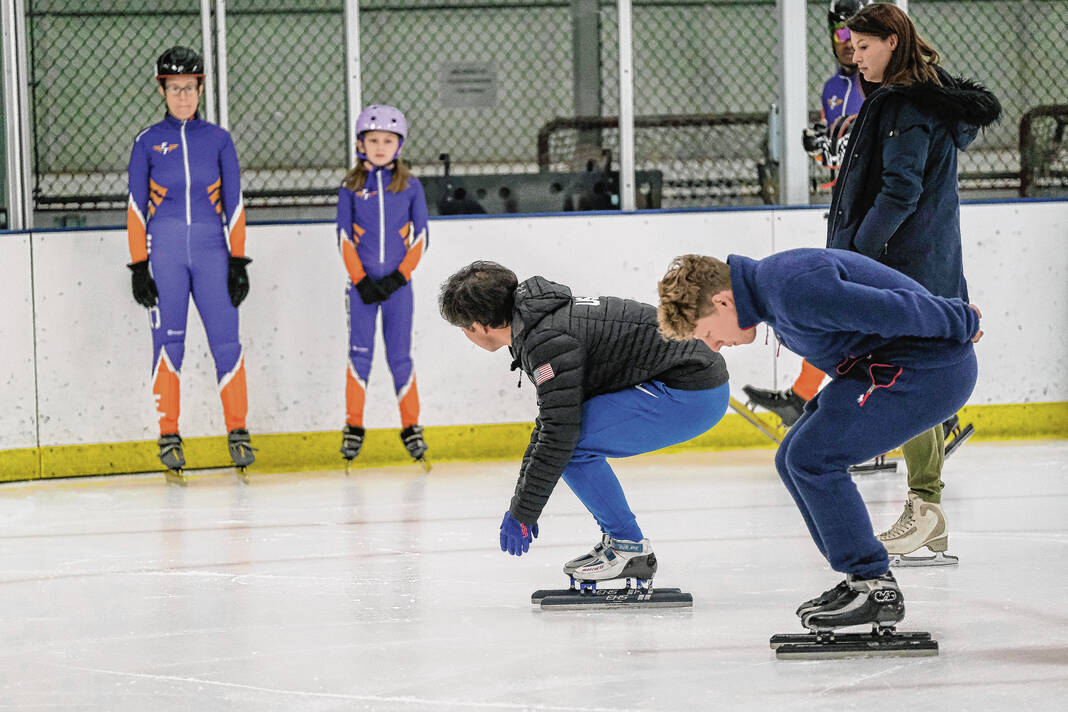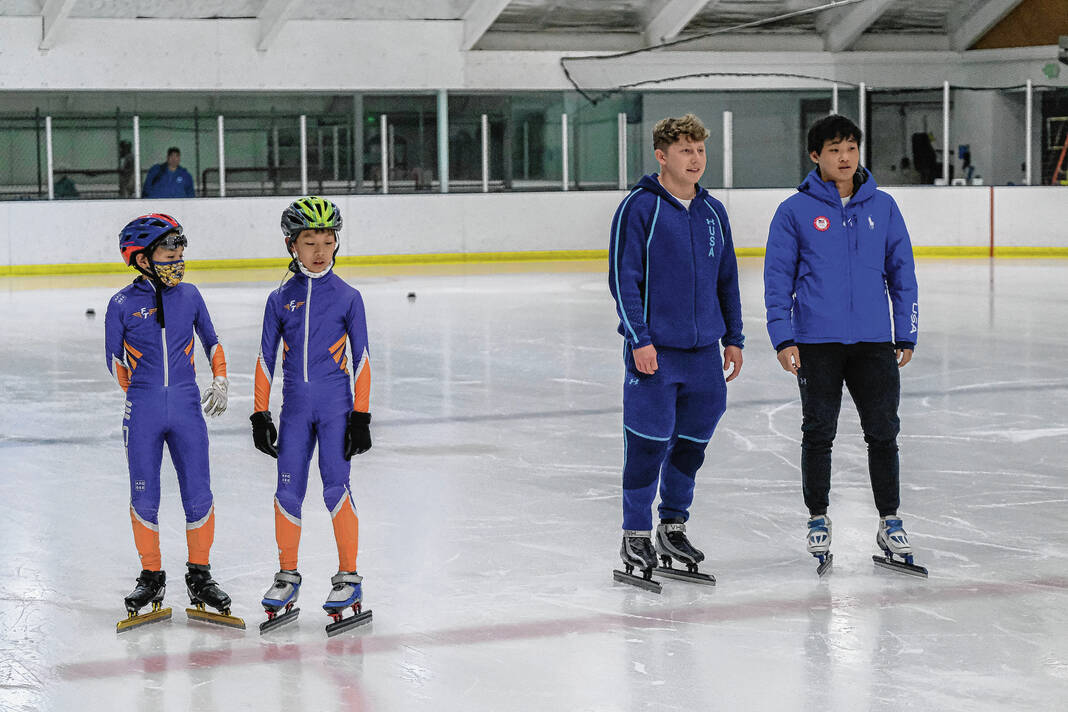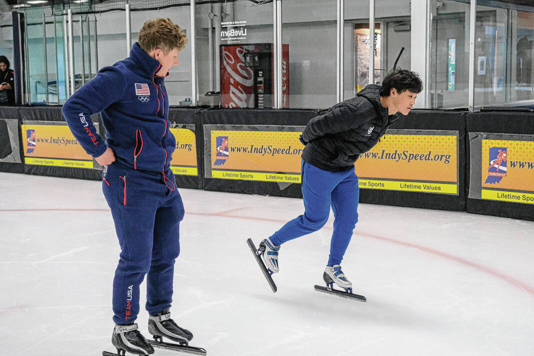 Mike Wolanin | The Republic Team USA speed skaters and 2022 Olympians Andrew Heo, left, and Austin Kleba demonstrate a drill during a special practice session with members of the Full Throttle Speed Skating Team as part of US Speedskating’s 2022 Tour of the Olympians at the Hamilton Community Center and Ice Arena in Columbus, Ind., Thursday, April 14, 2022.