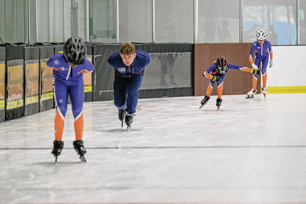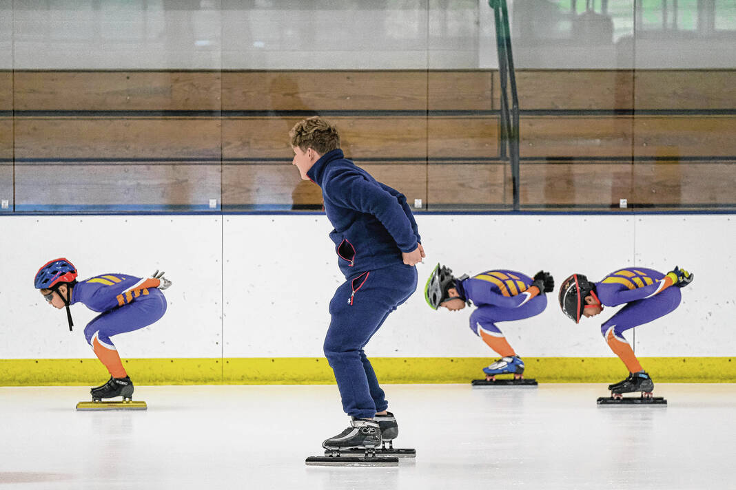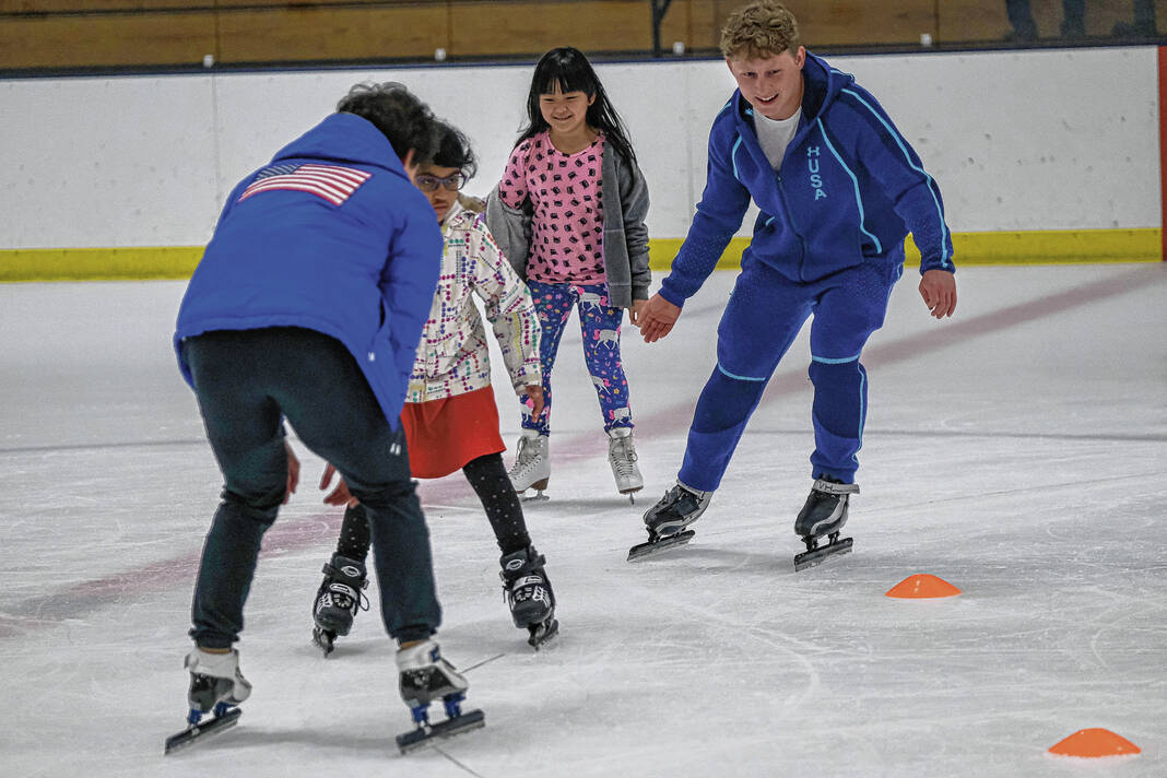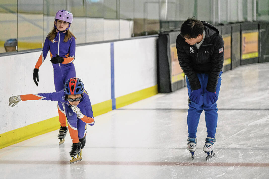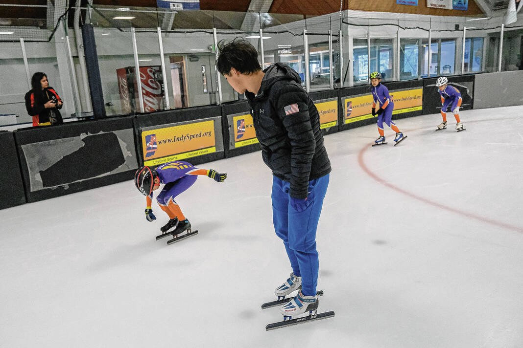 Mike Wolanin | The Republic Team USA speed skaters and 2022 Olympians Andrew Heo, left, and Austin Kleba demonstrate a drill during a special practice session with members of the Full Throttle Speed Skating Team as part of US Speedskating’s 2022 Tour of the Olympians at the Hamilton Community Center and Ice Arena in Columbus, Ind., Thursday, April 14, 2022.