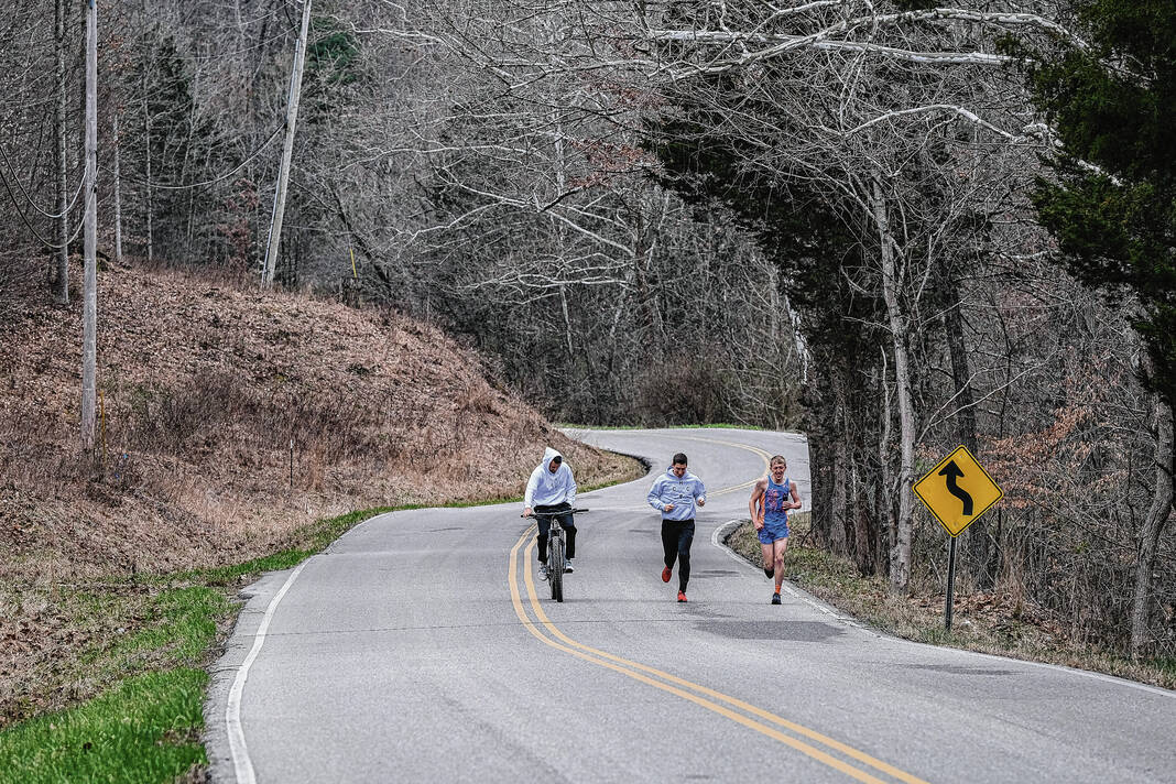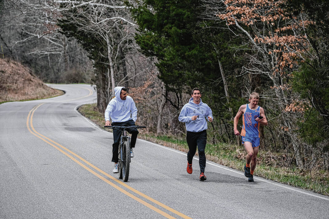Mike Wolanin | The Republic Malachi Henry, from left, paces Kasey Coleman and Josh Holley on a training run near Grandview Lake in Columbus, Ind., Friday, April 1, 2022. Holley, a Special Olympics athlete, has qualified to compete in the Boston Marathon. He has been training with Henry and Coleman for the marathon, and Coleman will be Holley’s support runner.
