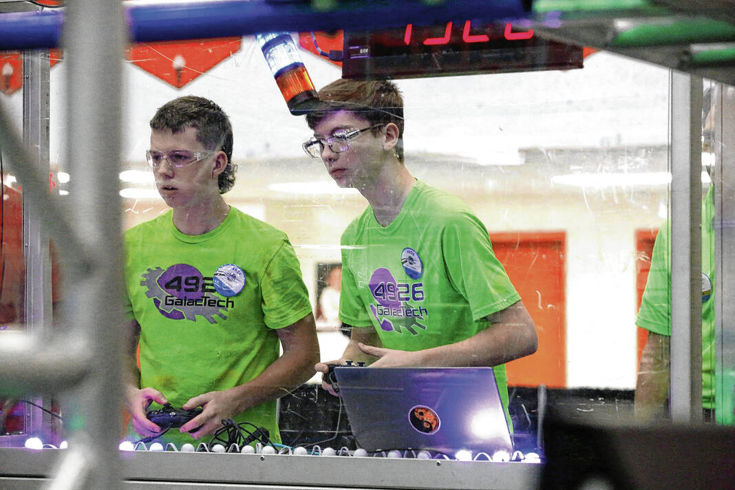 Asher Lamb, driver, and Isaac Kannianen,operator, for Team 4926 GalacTech of Columbus, Indiana, during a qualifying round of the FIRST Robotics Competition held at Columbus East High School, Saturday, March 19, 2022 Carla Clark | For The Republic