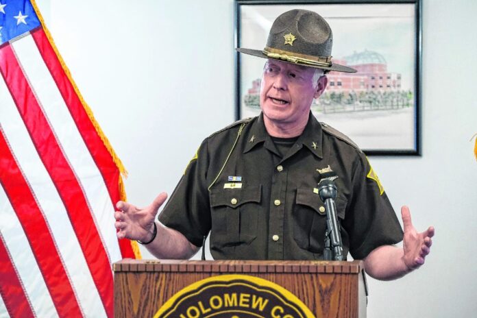 Bartholomew County Sheriff Matt Myers addresses members of the media about how members of the Bartholomew County Joint Narcotics Enforcement Team and an Organized Crime Drug Enforcement Task Force dismantled a large drug trafficking organization in Bartholomew county during a press conference at the Bartholomew County Sheriff's Office in Columbus, Ind., Wednesday, March 31, 2021. Mike Wolanin | The Republic