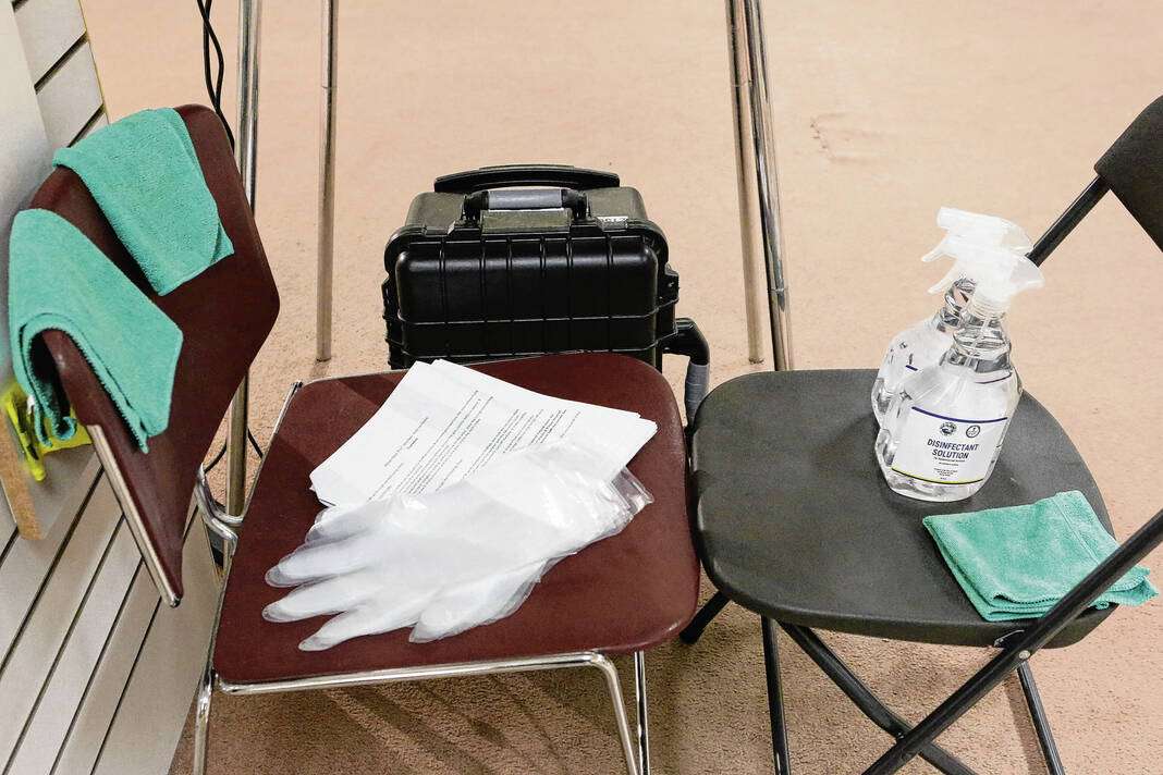 Carla Clark | For The Republic Some of the disinfecting supplies at the voting center located at Nexus Park in Columbus, Indiana, Tuesday, April 5, 2022.