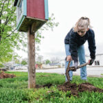Mike Wolanin | The Republic CSA New Tech ninth grader Kinleigh Miller digs a hole to plant irises as part of a series of environmental projects at CSA New Tech in Columbus, Ind., Thursday, May 5, 2022.