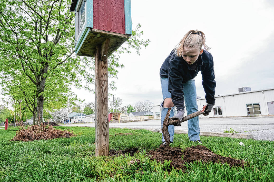 Mike Wolanin | The Republic CSA New Tech ninth grader Kinleigh Miller digs a hole to plant irises as part of a series of environmental projects at CSA New Tech in Columbus, Ind., Thursday, May 5, 2022.