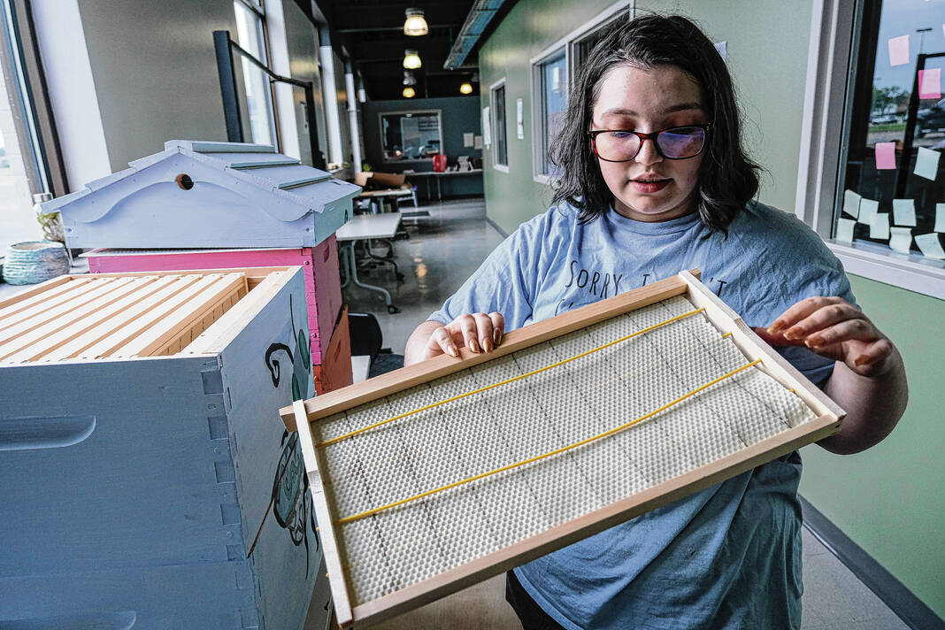 Mike Wolanin | The Republic CSA New Tech 11th grader Lydia Ferril shows beehives designed and built by CSA New Tech students for series of environmental projects at CSA New Tech in Columbus, Ind., Thursday, May 5, 2022.