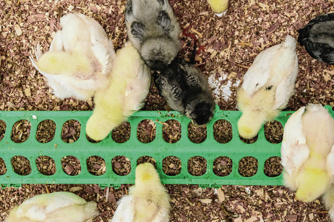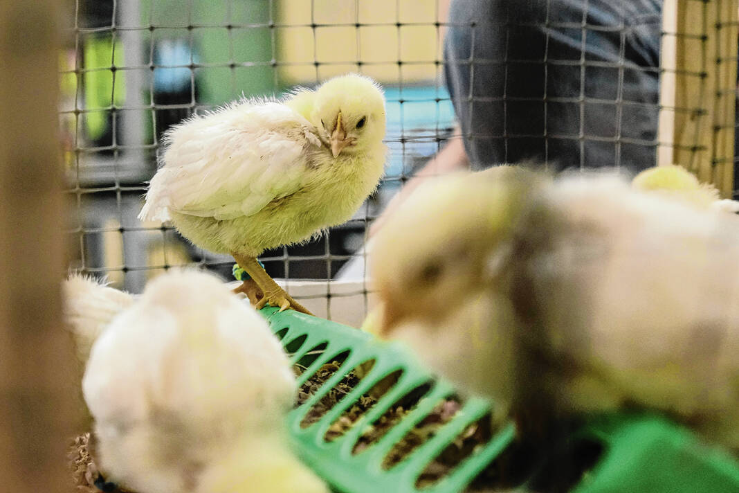 Mike Wolanin | The Republic A chick stands of a feeding trough in a cage at CSA New Tech in Columbus, Ind., Thursday, May 5, 2022. The chicks were hatched and are cared for by CSA New Tech students.