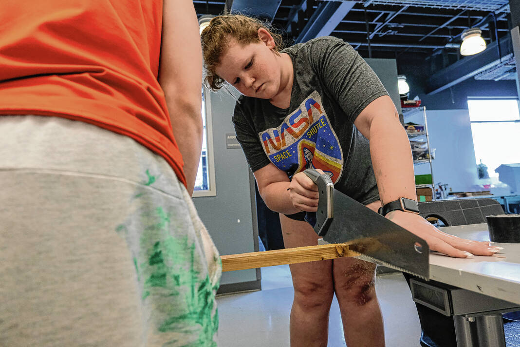 Mike Wolanin | The Republic CSA New Tech ninth graders Bex Sidwell, left, and Alyssa Whitted cut a support for a cage of chicks as part of a series of environmental projects at CSA New Tech in Columbus, Ind., Thursday, May 5, 2022.