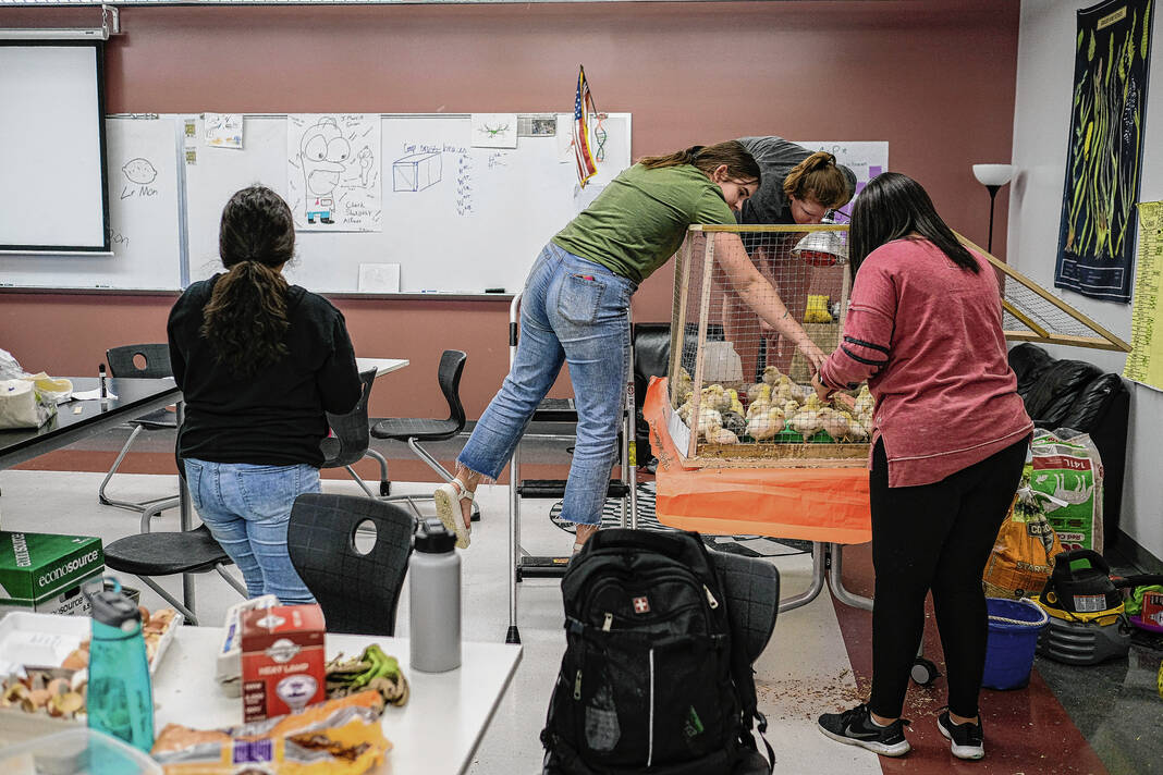 Mike Wolanin | The Republic CSA New Tech students tend their chicks as part of a series of environmental projects at CSA New Tech in Columbus, Ind., Thursday, May 5, 2022.