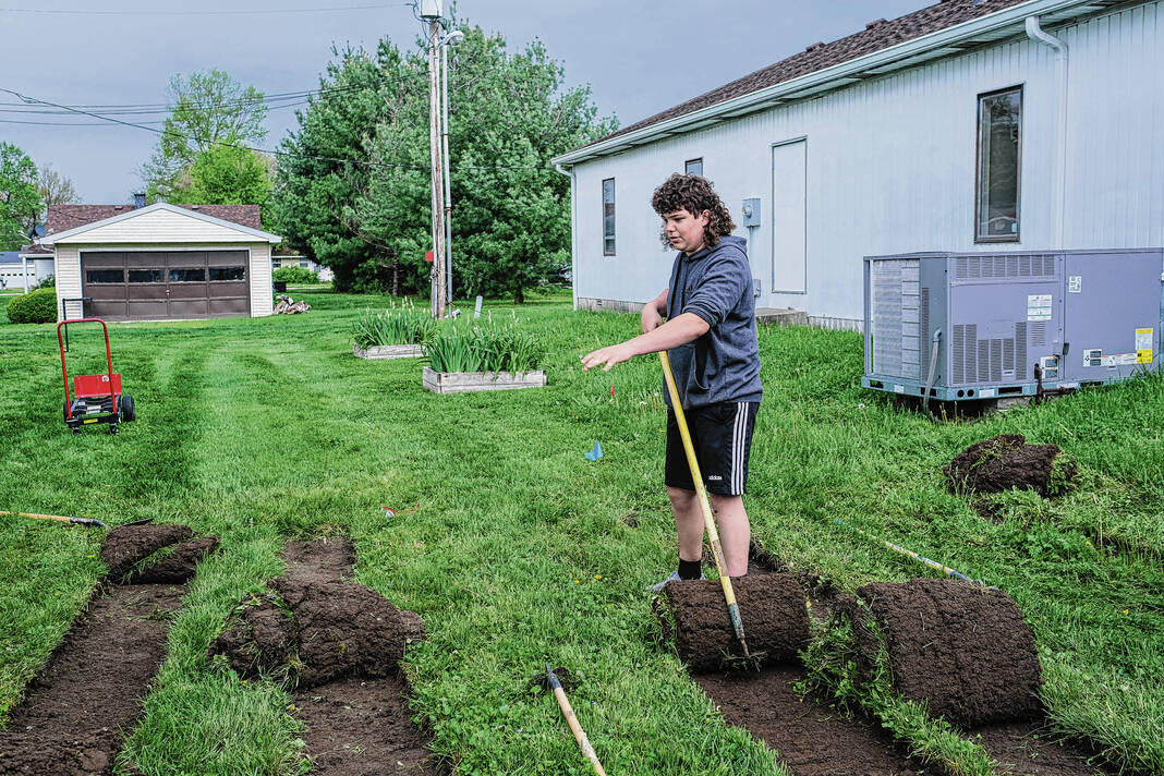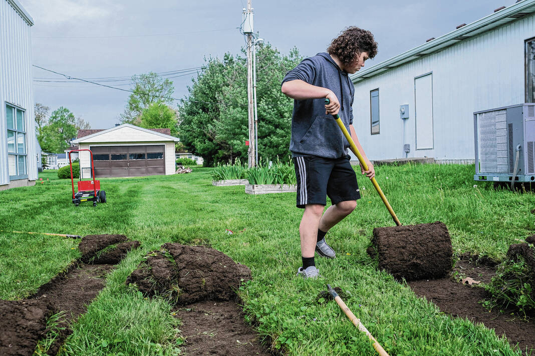 Mike Wolanin | The Republic CSA New Tech ninth grader Briceon Ernest strips sod as part of a series of environmental projects at CSA New Tech in Columbus, Ind., Thursday, May 5, 2022.