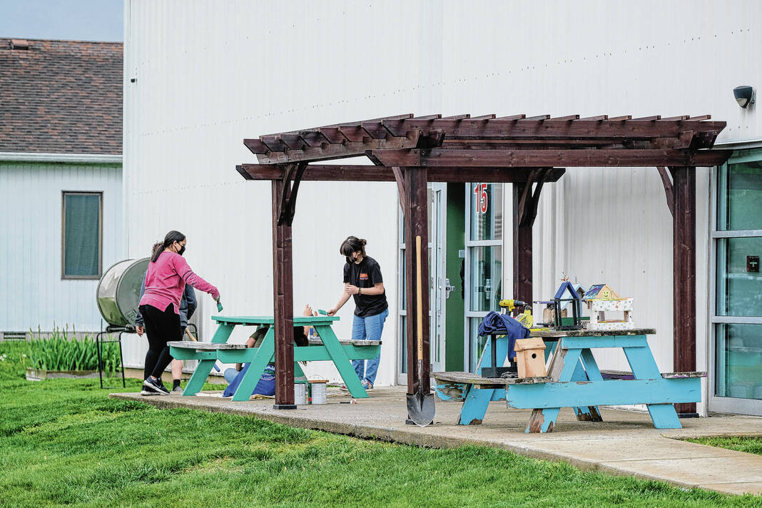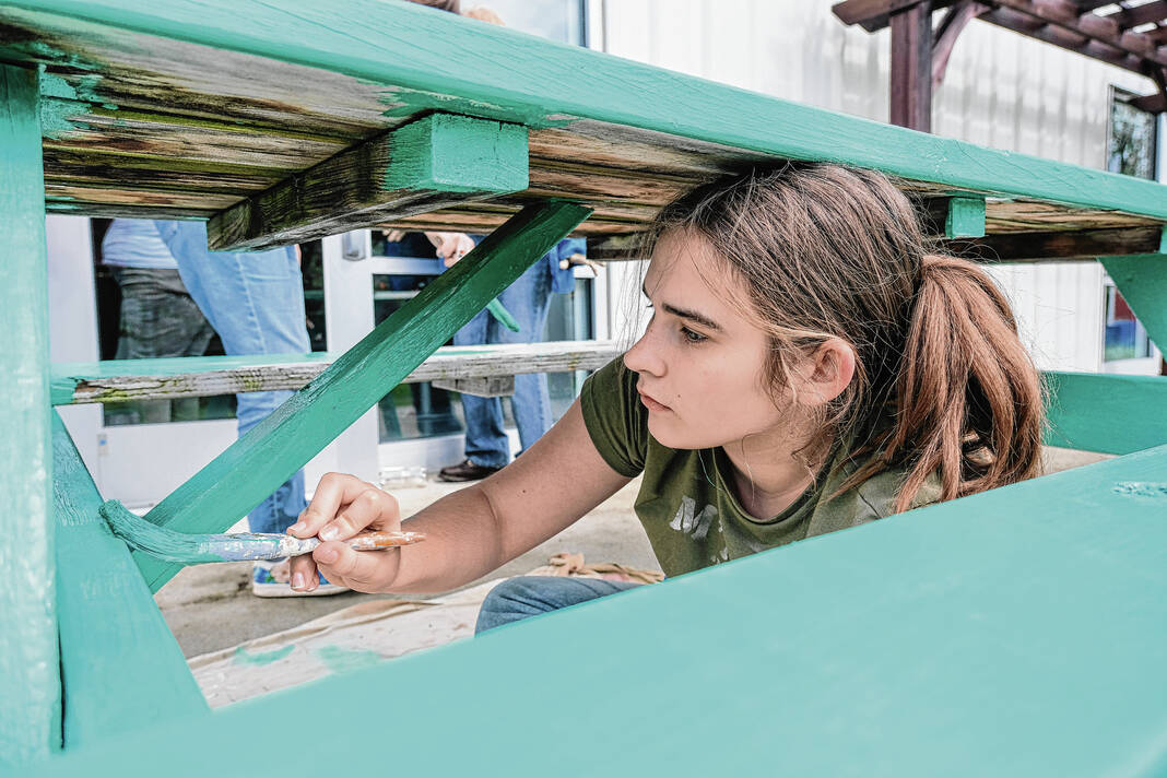 Mike Wolanin | The Republic CSA New Tech ninth grader Natalie Lewis paints a picnic table as part of a series of environmental projects at CSA New Tech in Columbus, Ind., Thursday, May 5, 2022.