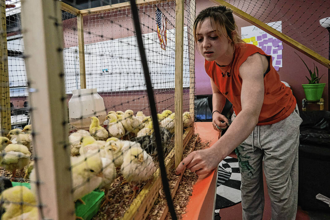 Mike Wolanin | The Republic CSA New Tech ninth grader Bex Sidwell checks the structural integrity of a cage containing chicks as part of a series of environmental projects at CSA New Tech in Columbus, Ind., Thursday, May 5, 2022.