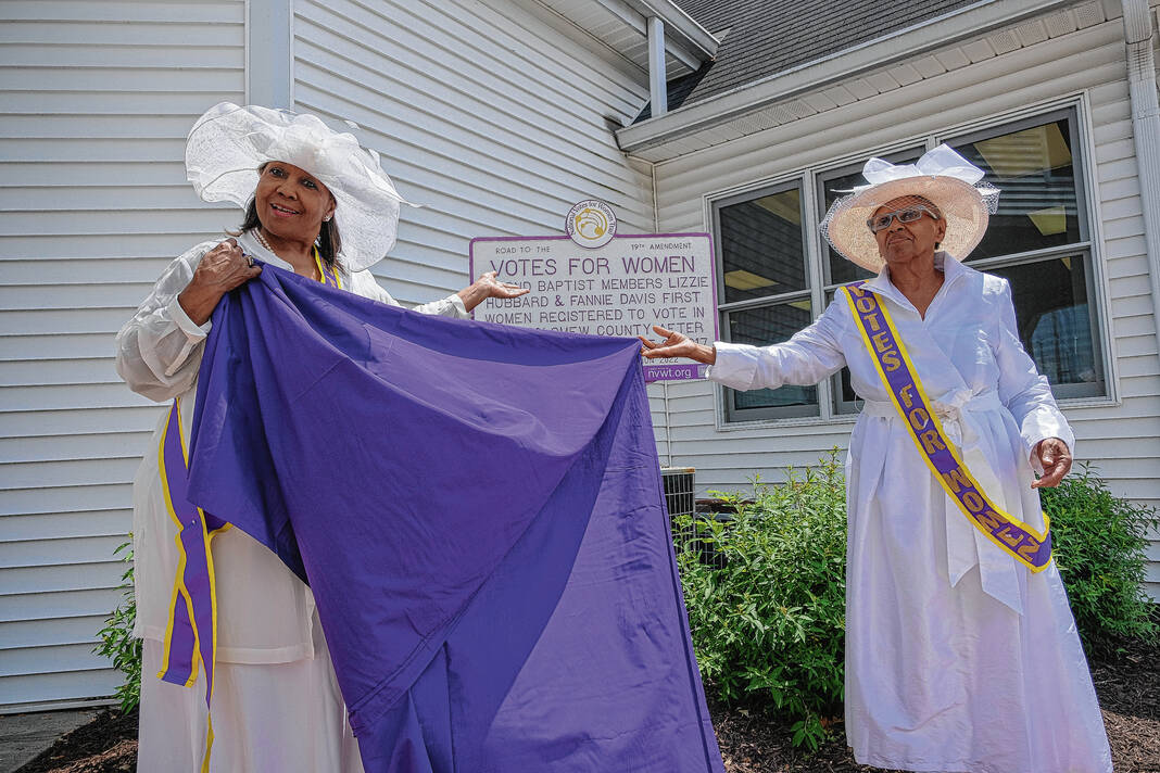 Mike Wolanin | The Republic Roxanne Stallworth, left, and Paulette Roberts unveil a marker honoring Black suffragists Lizzie Hubbard and Fannie Davis at Second Baptist Church in Columbus, Ind., Saturday, May 14, 2022. Hubbard and Davis were the first two women registered to vote in Bartholomew County after the Partial Suffrage Act of 1917.