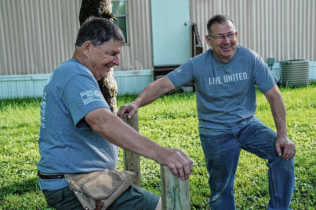 Mike Wolanin | The Republic Volunteers Jim Kahlenbeck, left, and Shawn Kleinpeter talk while building a wheelchair ramp at a home in Candlelight Village for the United Way’s Day of Caring in Columbus, Ind., Friday, May 20, 2022.