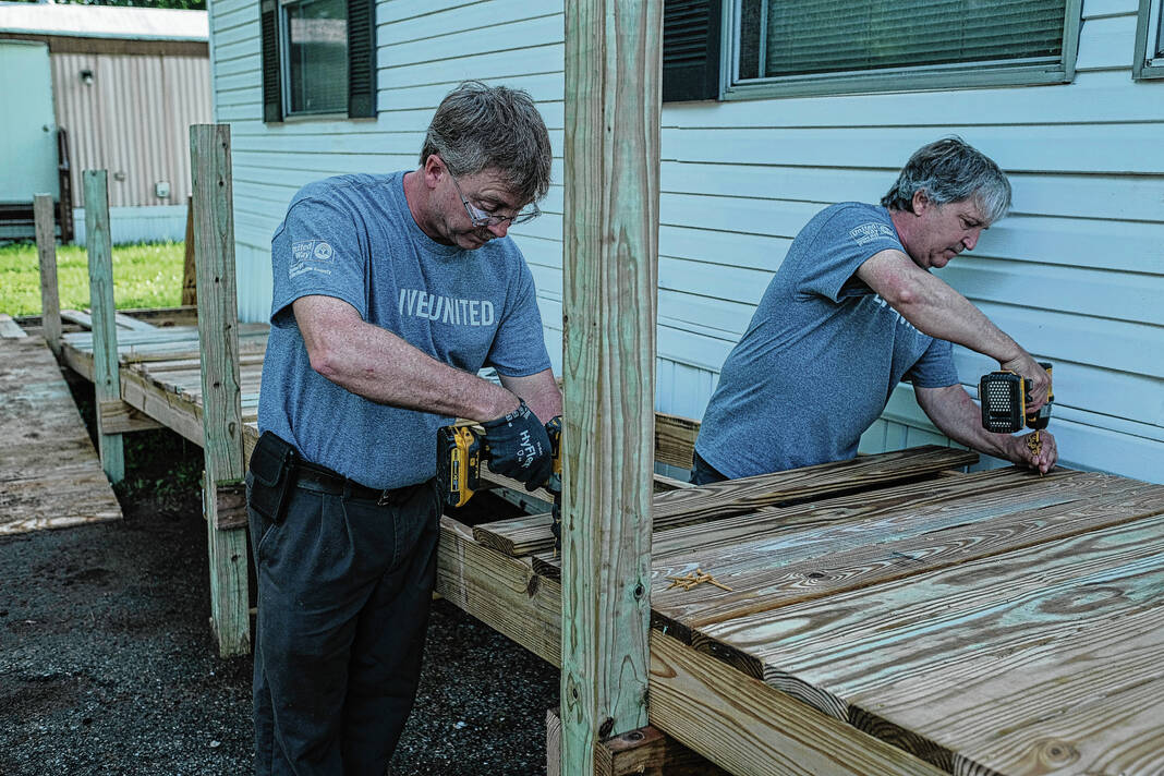 Mike Wolanin | The Republic Volunteers Craig Weinstock, left, and Jeff Crouse help build a wheelchair ramp at a home in Candlelight Village for the United Way’s Day of Caring in Columbus, Ind., Friday, May 20, 2022.