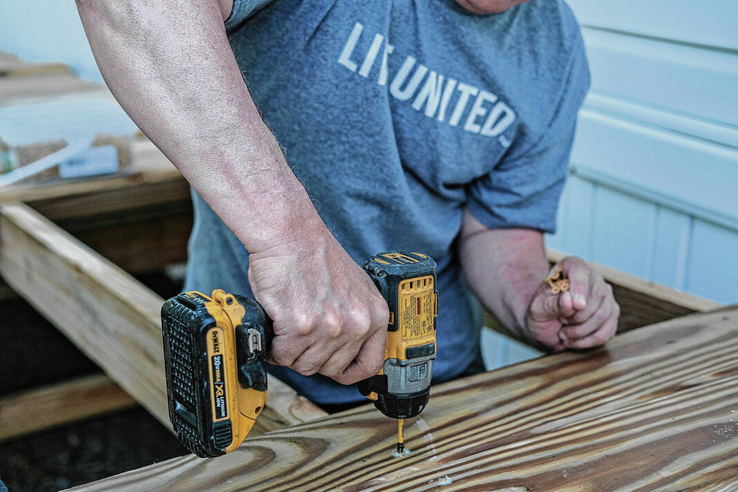 Mike Wolanin | The Republic Volunteer Jeff Crouse helps build a wheelchair ramp at a home in Candlelight Village for the United Way’s Day of Caring in Columbus, Ind., Friday, May 20, 2022.