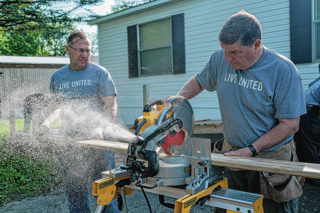 Mike Wolanin | The Republic Volunteers Jim Kahlenbeck, right, and Shawn Kleinpeter trim boards while building a wheelchair ramp at a home in Candlelight Village for the United Way’s Day of Caring in Columbus, Ind., Friday, May 20, 2022.