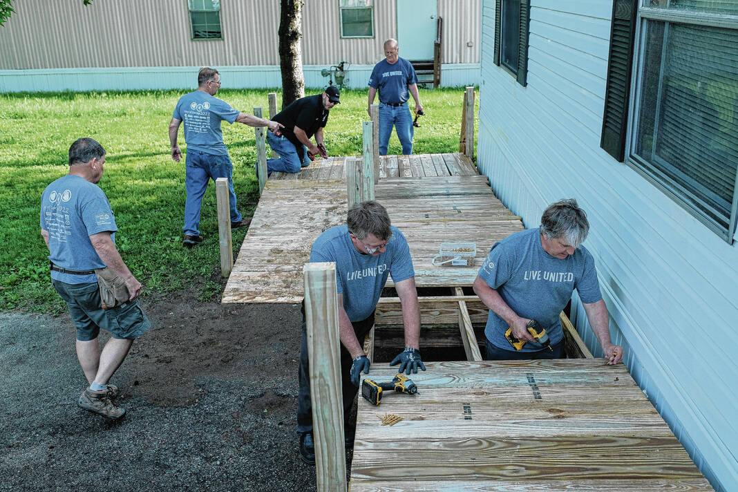 Mike Wolanin | The Republic Volunteers build a wheelchair ramp at a home in Candlelight Village for the United Way’s Day of Caring in Columbus, Ind., Friday, May 20, 2022.