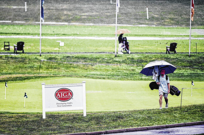A golfer shields himself from the rain as he leaves the practice area to head to the clubhouse as the final round of the 2021 Circle K Junior Championship Hosted By Otter Creek is canceled due to the weather in Columbus, Ind., Thursday, July 1, 2021.