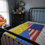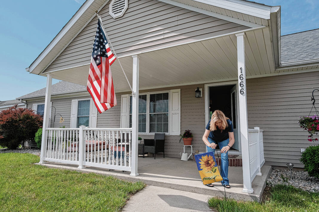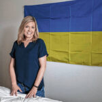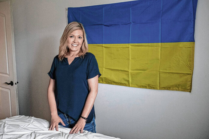 Mike Wolanin | The Republic Susan Thompson poses for a photo next the a Ukrainian flag in a rooms she has prepared in her house to host a Ukranian refugee family in Columbus, Ind., Monday, May 23, 2022.