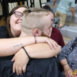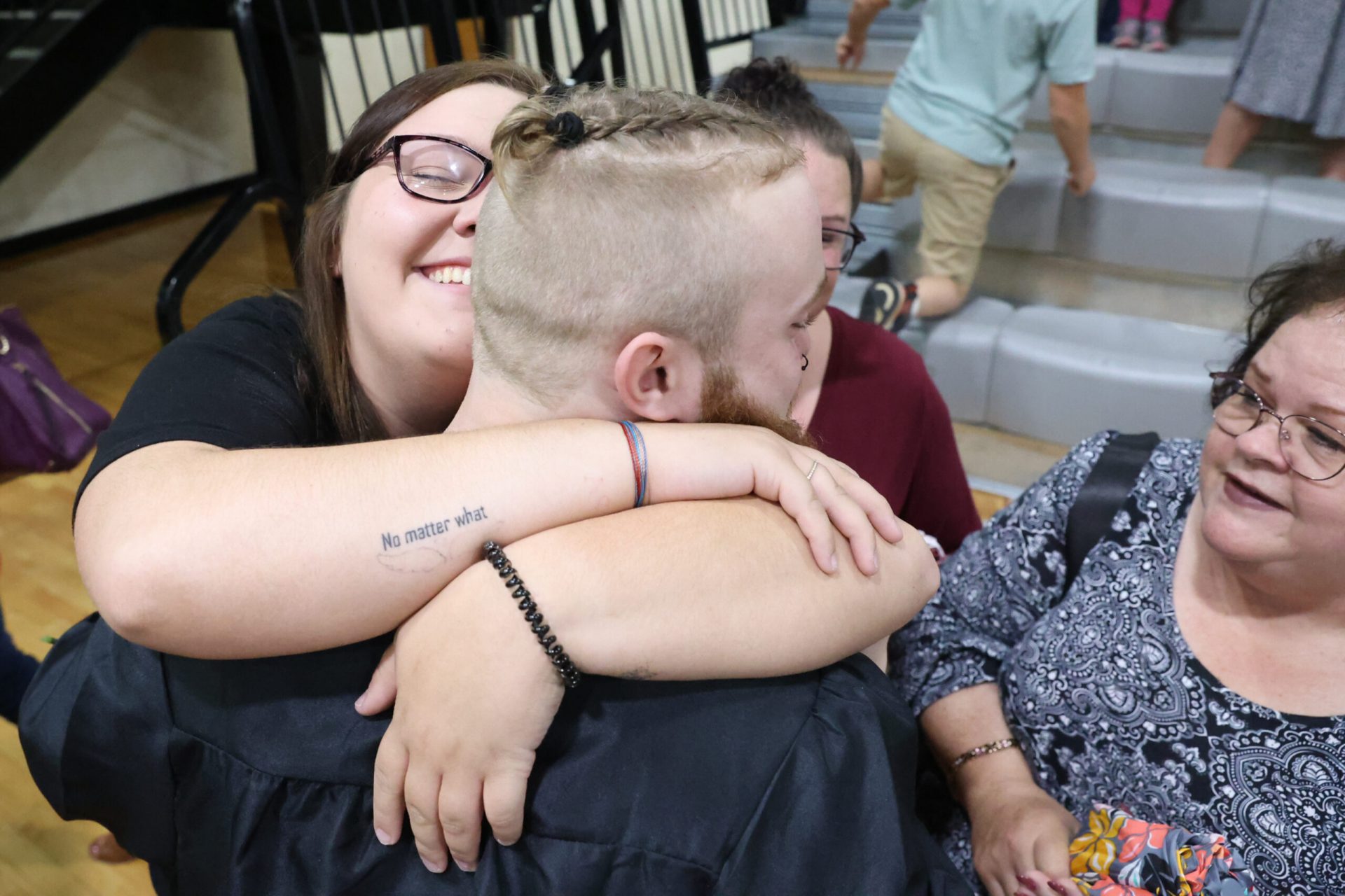 Addison James wraps her graduate brother, Spencer James, in her arms as their mother and grandmother look on after the Hauser graduation May 27, 2022. Greg Jones| For The Republic