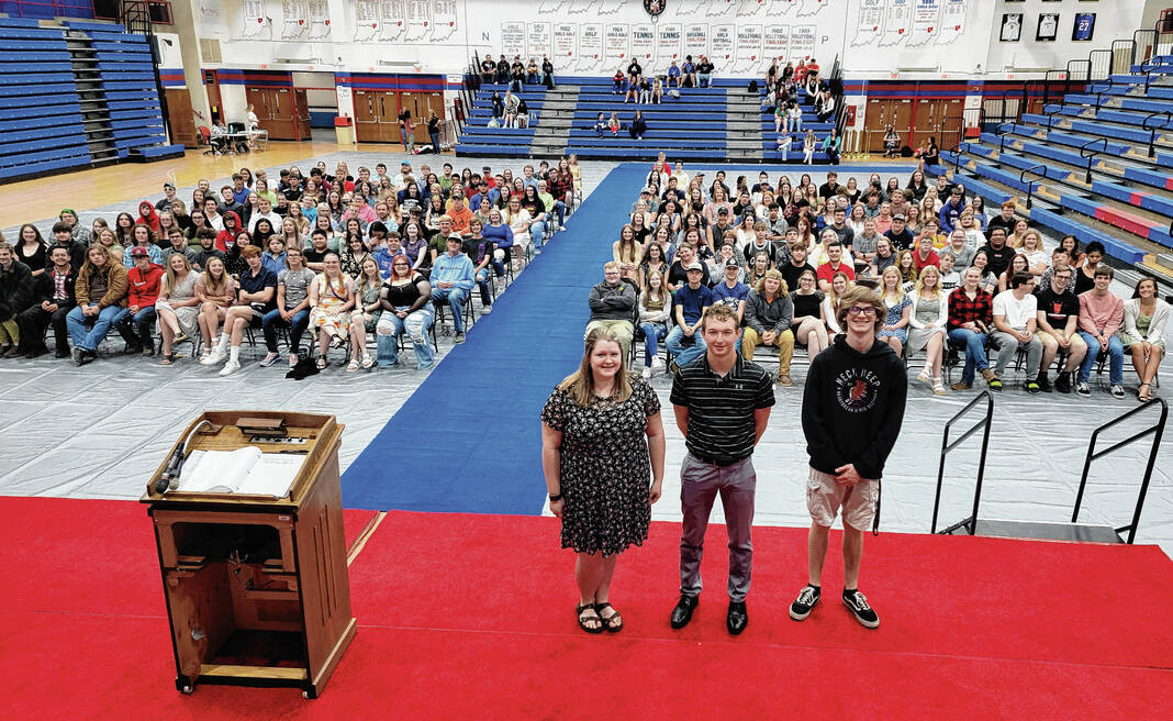 Jennings County High School senior class president Greyson Jackson, center, stands between the top two academic members of the graduating class, Emma Jones and Zachary Brooks, and before the JCHS Class of 2022.